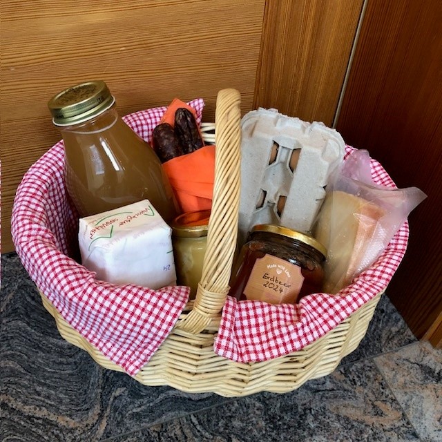 Latte fresco di mucca, sciroppo di sambuco*, succo di mela, marmellate fatte in casa (albicocca*, fragola*, lampone*, ciliegia*, prugna*, mela cotogna*), miele, salsicce di cervo*, formaggio di malga, burro dalla malga o dal caseificio Burgusio, uova, verdure stagionali dal nostro orto*, diverse varietà di pane dal panificio Schuster (i prodotti contrassegnati con * sono di nostra produzione)